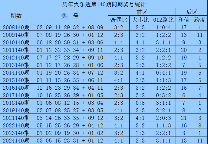 后离别析:在第140期历史同时开奖中,和值大小为8:8,跨度奇偶比为12:4,本期后区安宁两码01和11。